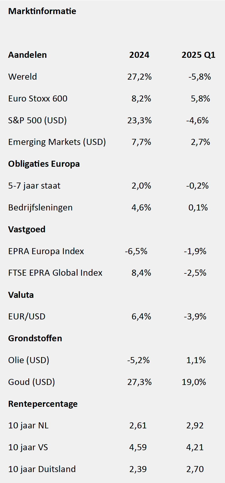 Na een voortvarende start van 2025 zijn de meeste beleggers in aandelen teleurgesteld het kwartaal uitgegaan. Op 19 februari stonden er nog verse “all time highs” op diverse borden wereldwijd. En sinds de lancering van de AI-chatbot DeepSeek leken aandelen van technologiebedrijven in China met een winst van ongeveer 20% nog steeds in een “bullmarket” te zitten. Maar termen als aanhoudende inflatie en kans op een recessie werden gedurende het kwartaal met name in de V.S. steeds vaker genoemd. De “breed” samengestelde wereldindex, met een weging van circa 70% in Amerikaanse aandelen, eindigde uiteindelijk in mineur door winstnemingen. In Euro gemeten verloor de wereldindex bijna 6% vanaf 1 januari.