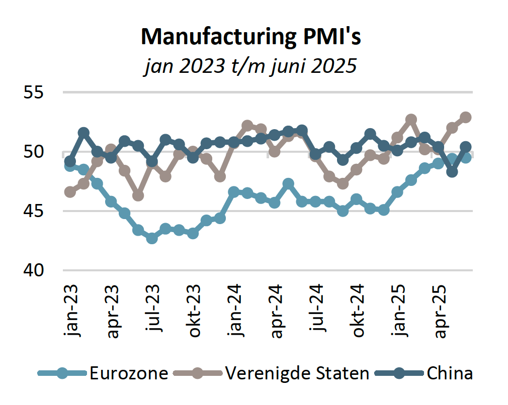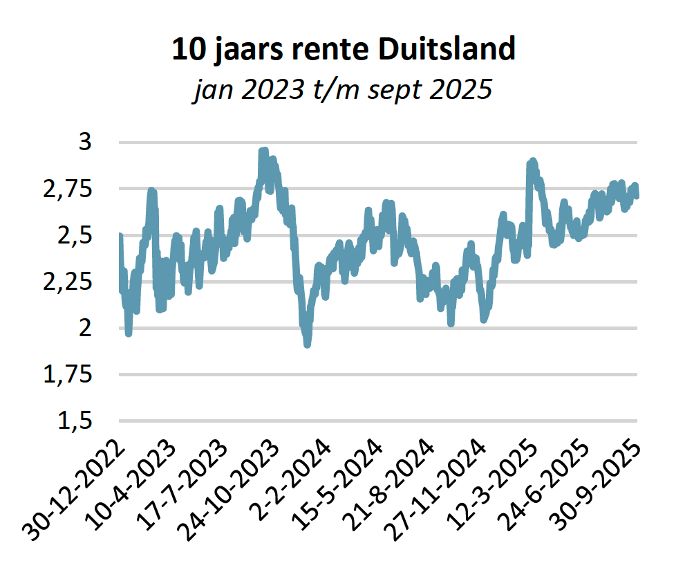 In Europa was de kerninflatie stabiel op het gewenste niveau en in de V.S. iets daarboven (2,9%). De consumentenprijzen in de eurozone liepen in september met 2,2% licht op, maar de kerninflatie en producentenprijzen niet. In de V.S. heeft de FED een dubbel mandaat van prijsstabiliteit én maximale werkgelegenheid. Voor dat laatste zagen we de cijfers, ondanks het uitzetten van werkende illegalen, in het afgelopen kwartaal duidelijk verslechteren. Dat gaf Powell de mogelijkheid om toch een aantal renteverlagingen in het vooruitzicht te stellen.