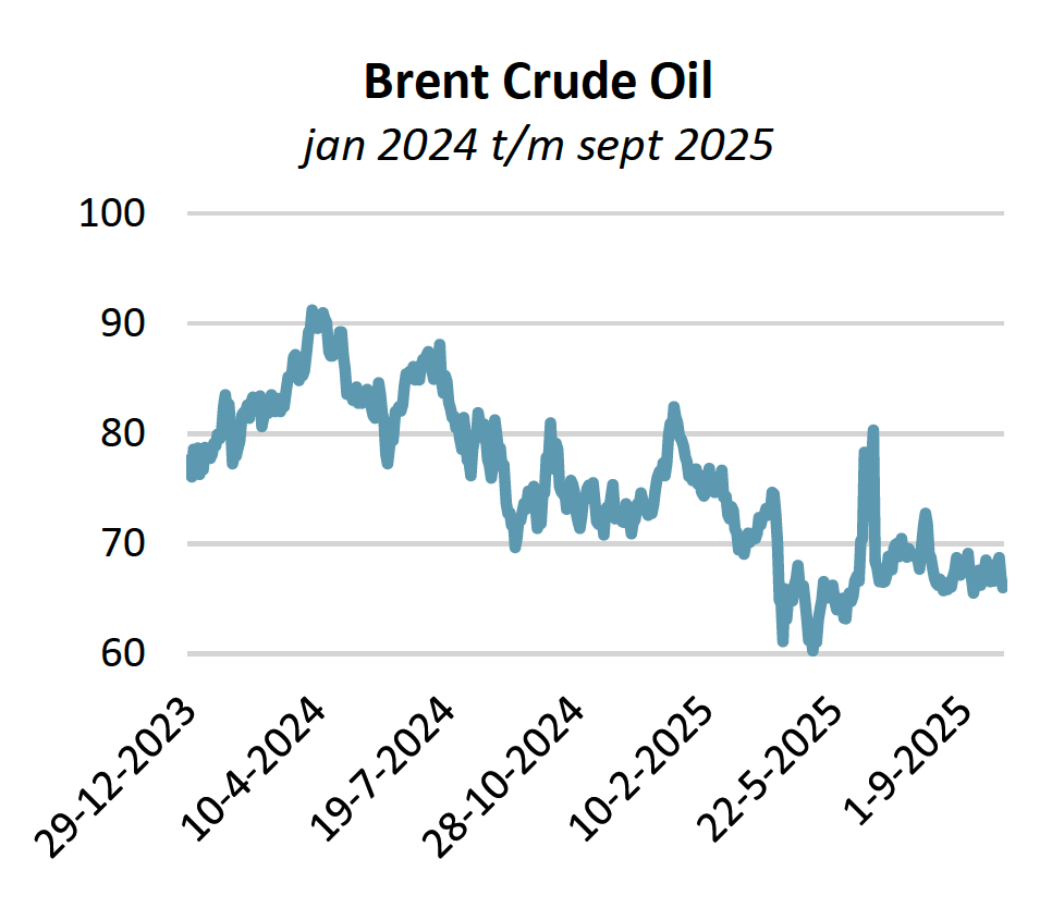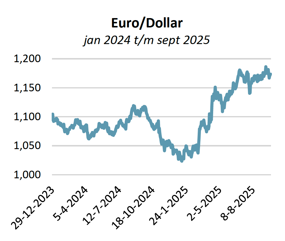 De US Dollar is in het afgelopen kwartaal licht in waarde gedaald ten opzichte van de Euro. Dat bracht de daling voor heel 2025 op 30 september op ongeveer 11,5%. Ook ten opzichte van een mandje met meerdere valuta is de US Dollar gedaald. Dit verbeterde de concurrentiepositie van Amerikaanse bedrijven die afhankelijk zijn van export, maar zorgde ook voor import van inflatie. China, dé grote concurrent, zag de waarde van zijn munt dit jaar “slechts” 2,5% appreciëren ten opzichte van de US Dollar.